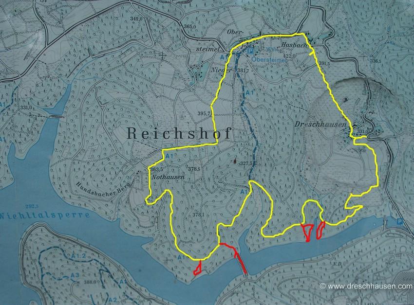 Unsere Wanderung beginnt am Dorfplatz in Reichshof-Dreschhausen. Falls Sie mit dem Auto anreisen und vielleicht sogar über ein Navigationsgerät verfügen dann lautet die Adresse :